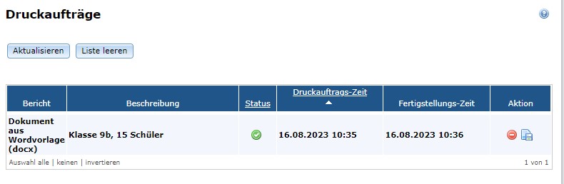 Über den Menüpunkt DRUCKAUFTRÄGE haben Sie die Möglichkeit, sich die Liste Ihrer bereits getätigten Druckaufträge anzeigen zu lassen. Sie können sehen, ob es sich um eine Word-oder pdf-Datei oder eine Excel-Tabelle handelt, welchen Status das Dokument hat und wann der Druck fertiggestellt wurde. Über das Minuszeichen können sie den Druckauftrag endgültig löschen oder das Dokument erneut über das Diskettensymbol aufrufen.